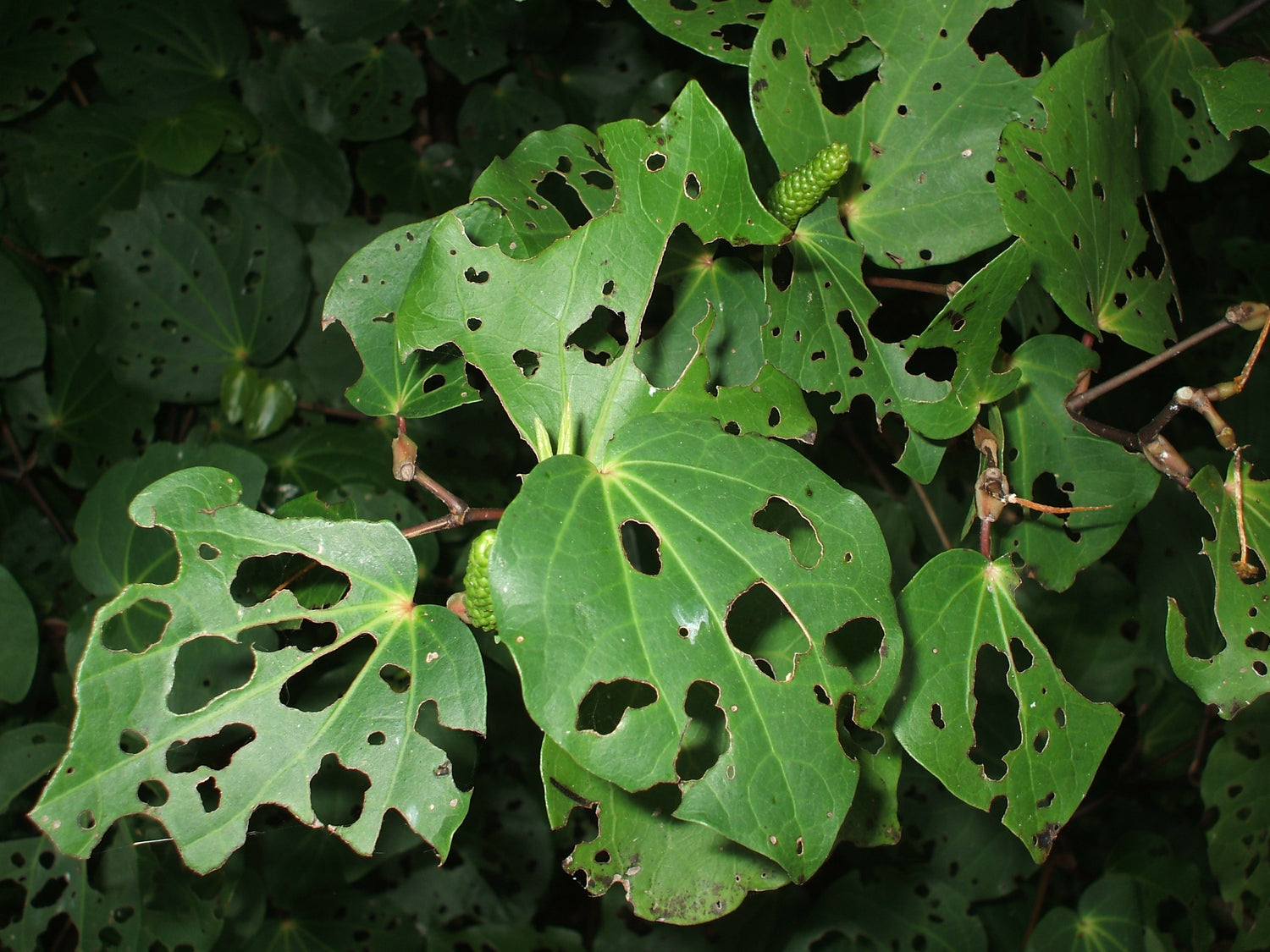 Kawakawa (macropiper excelsum) is a herbaceous shrub with knobbly joints and branching stems native to Aotearoa. It has large heart shaped leaves that are a dark green, and sometimes slightly glossy.
